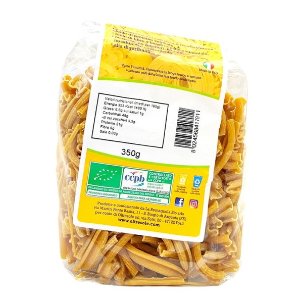 Le Penne di Ceci Biologiche di Oltresole sono realizzate con il 100% di farina di ceci semi-integrale biologica e italiana, certificata Gluten Free. Viene lavorata artigianalmente con trafila al bronzo ed essiccazione lenta a bassa temperatura. Questo processo consente di preservare struttura, aroma e caratteristiche organolettiche della materia prima. La superficie risulta naturalmente ruvida, ideale per trattenere i condimenti, mentre la consistenza è compatta e piacevolmente tenace al morso. Il sapore è pieno, con la tipica nota intensa e leggermente rustica del cece.