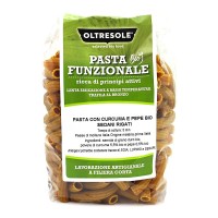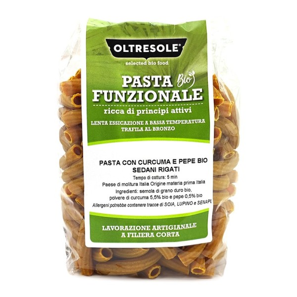 I sedani rigati di grano duro, curcuma e pepe Oltresole sono una pasta dal sapore unico. Biologici e prodotti interamente in Italia con soli prodotti nostrani, i sedani rigati curcuma e pepe sono ideali abbinati a un condimento di verdure: carote e zucchine tagliate a julienne con un filo di olio extravergine. Difatti secondo un famoso studio scientifico condotto nel 1998 da Ghosh Shobha e altri ricercatori, l’aggiunta del pepe nero incrementa l’assorbimento della curcumina del 2000% (ovvero di 20 volte); ma non solo, anche l’olio extravergine d’oliva rende più biodisponibile la curcumina. Uno dei motivi per cui il nostro corpo non riesce ad assorbirla è la sua scarsa solubilità in acqua: l’olio ne aumenta la solubilità.