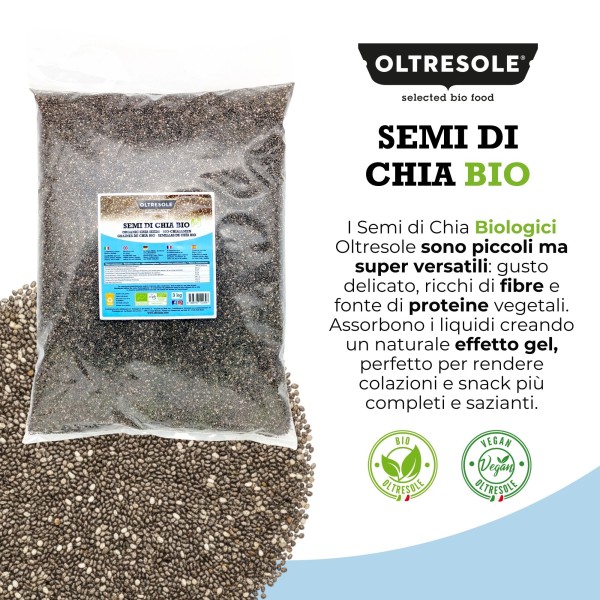 I Semi di Chia Biologici Oltresole sono selezionati da coltivazioni biologiche e puliti con cura per portare in cucina un ingrediente semplice, naturale e super pratico. Minuscoli, scuri e lucidi, hanno un gusto delicato e neutro: perfetti per entrare facilmente nelle ricette di ogni giorno, dal dolce al salato.