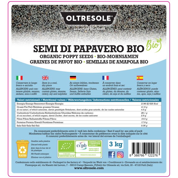 I Semi di Papavero Biologici Oltresole sono un ingrediente genuino e naturale, selezionato da coltivazioni biologiche e lavorato con cura per preservarne profumo e qualità. Piccoli e riconoscibili per il colore nero-bluastro, sprigionano un aroma intenso e caratteristico, legato alla presenza di componenti naturalmente profumate che li rendono ideali per dare un tocco speciale alle ricette. Basta una spolverata per aggiungere personalità al piatto, mantenendo un gusto elegante e mai invadente.