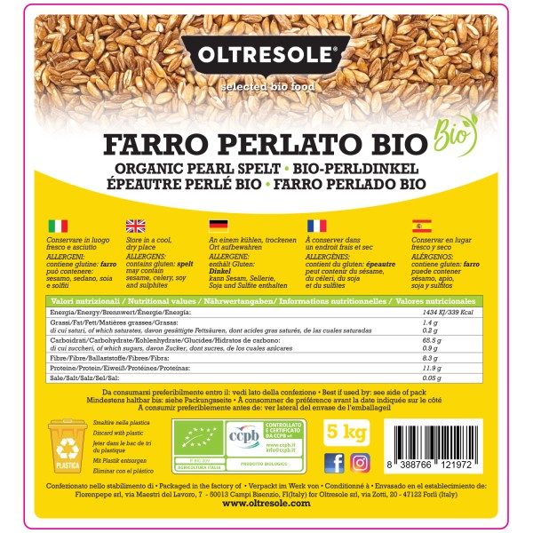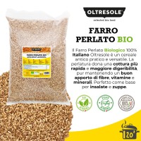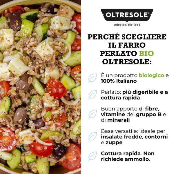 Il farro perlato biologico Oltresole è prodotto in Italia da coltivazioni biologiche certificate. La perlatura rimuove la pellicola esterna del chicco, rendendolo più pratico da cucinare e più delicato al palato, senza rinunciare a un profilo nutriente. Questo procedimento permette anche di ottenere una cottura più rapida e a renderlo più digeribile.