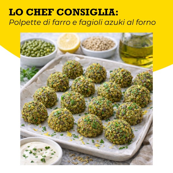 Forma le polpette, disponile su teglia con carta forno, spennella con poco olio. Cuoci a 200°C per 18–22 min, girandole a metà, finché dorate. Si consiglia una salsa da abbinare: Yogurt (anche vegetale) + limone + sale + pepe + menta/prezzemolo; oppure: Tahina + acqua + limone + sale (crema simile all'hummus, ma senza ceci)