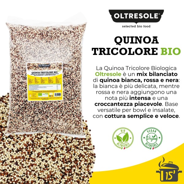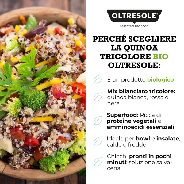 La quinoa tricolore biologica Oltresole è un mix bilanciato di chicchi bianchi, rossi e neri, selezionati da coltivazioni biologiche certificate. Pur essendo usata come un cereale, la quinoa non è un vero cereale: è il seme di una pianta erbacea (botanicamente diversa dalle graminacee), ed è apprezzata per la sua praticità e per il profilo nutrizionale interessante.