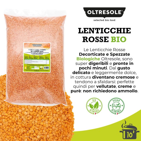 Non richiedono ammollo e cuociono in circa 8–10 minuti: durante la cottura tendono a disfarsi, diventando una base densa e vellutata. Sono ideali per zuppe cremose, purè, creme speziate, sughi e preparazioni in stile mediorientale o indiano, dove vengono spesso valorizzate con spezie e aromi.