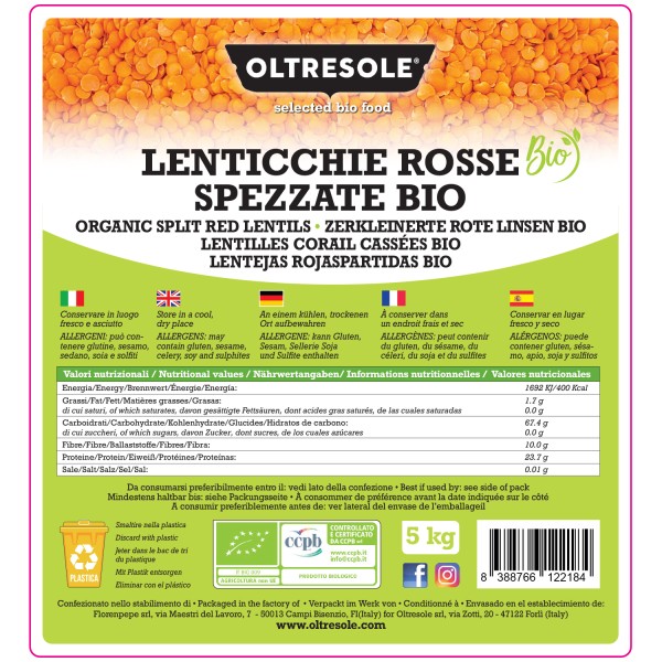 Le lenticchie rosse spezzate decorticate biologiche Oltresole provengono da agricoltura biologica controllata. Sono private della buccia e spezzate in due: una lavorazione che le rende molto pratiche in cucina e particolarmente adatte a ricette veloci. Si distinguono per il colore aranciato acceso e per la consistenza naturalmente cremosa che sviluppano in cottura, perfetta per piatti “comfort” e vellutate.