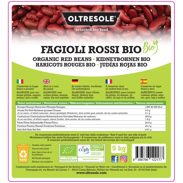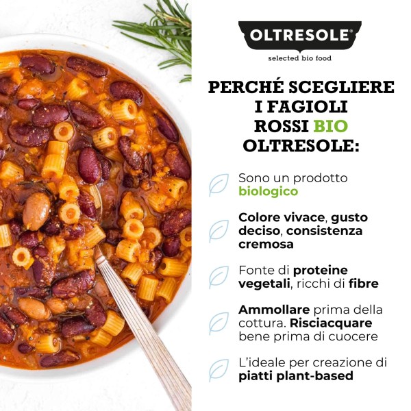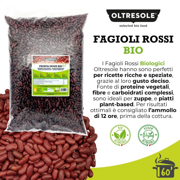 I fagioli rossi biologici Oltresole sono legumi selezionati da coltivazioni biologiche certificate, riconoscibili per il colore rosso vivace e il sapore pieno e deciso. Una volta cotti sviluppano una consistenza cremosa e compatta, che li rende ideali per piatti ricchi e strutturati, sia della tradizione mediterranea sia di quella internazionale.