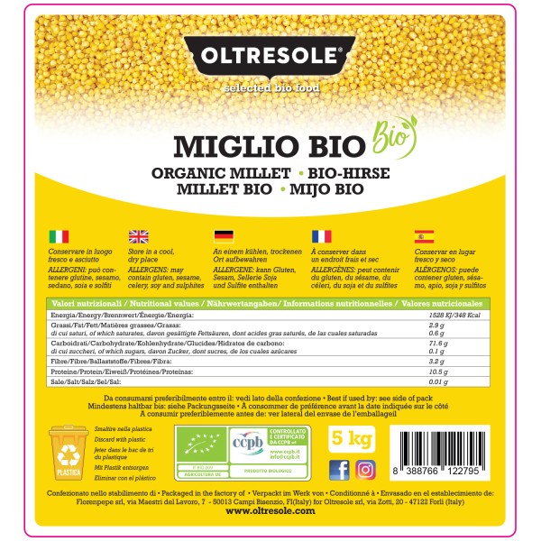 Il miglio bio Oltresole è perfetto in una dieta equilibrata, soprattutto per il suo potere rimineralizzante e rafforzante su unghie, capelli e ossa. Di colore giallo intenso e forma piccola e tondeggiante, il miglio fa parte della famiglia delle Graminacee. È altamente digeribile, ricco di carboidrati complessi, proteine vegetali e minerali essenziali come ferro, magnesio, fosforo e silicio.