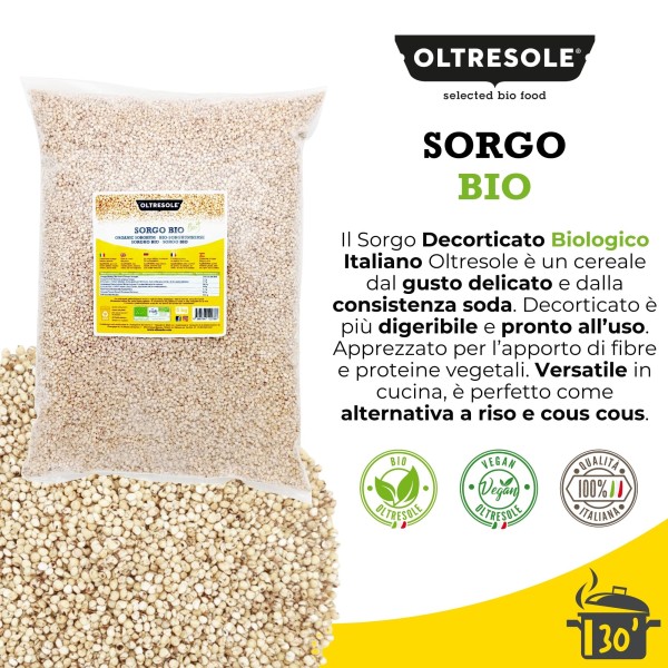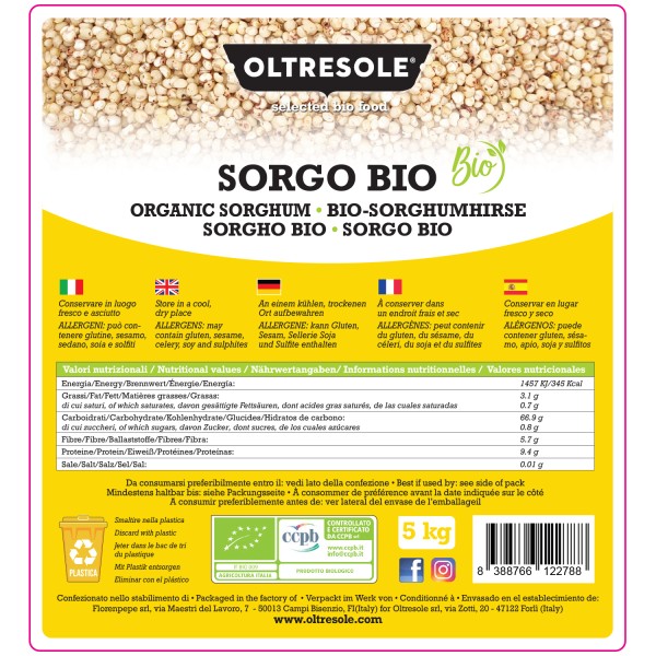 Il sorgo decorticato biologico Oltresole, nel formato convenienza da 5 Kg, viene coltivato in Italia secondo rigorosi standard biologici. Appartenente alla famiglia delle graminacee, il sorgo (Sorghum vulgare) è noto per la sua straordinaria resistenza a climi aridi e per la sua ricchezza nutrizionale. Il chicco, decorticato per essere più digeribile e pronto all’uso, si presenta con un sapore delicato e una consistenza soda, perfetto per ricette sane e gustose.