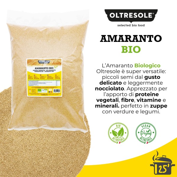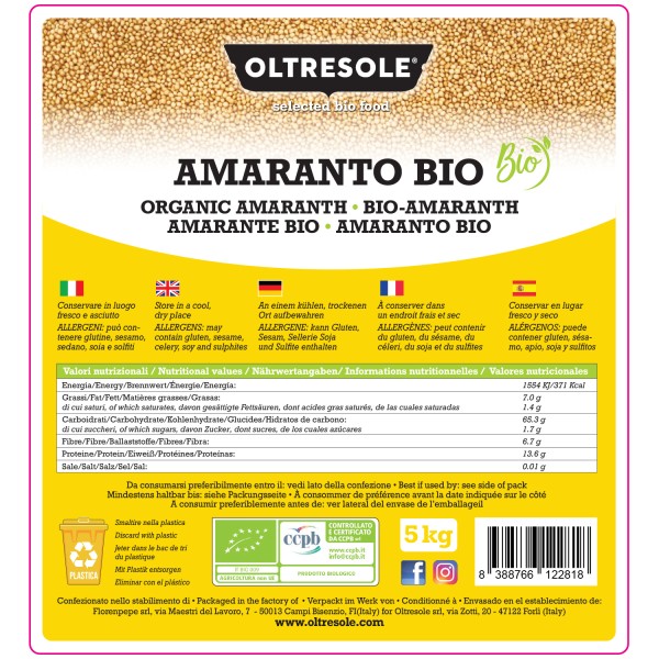 L’amaranto proposto da Oltresole, nella confezione convenienza da 5 kg, è certificato biologico e si presenta come un alimento altamente nutriente e versatile. Pur non essendo un vero e proprio cereale, infatti l’amaranto è classificato come pseudocereale: i suoi piccoli chicchi tondeggianti sono in realtà semi prodotti dal fiore della pianta.