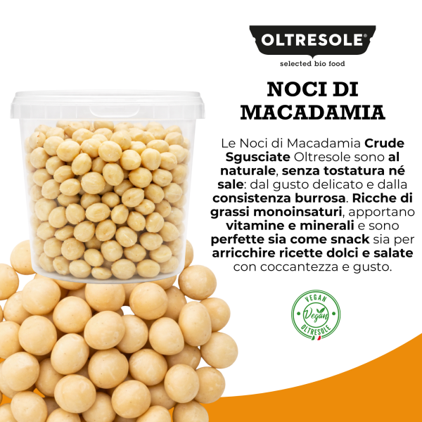 Le Noci di Macadamia Crude Sgusciate Oltresole sono una frutta secca di altissima qualità, selezionata per offrire uno snack naturale, autentico e raffinato. Non subendo processi di tostatura o salatura, mantengono intatto il loro sapore originale, caratterizzato da una consistenza cremosa e da un gusto delicato ma avvolgente, che le rende immediatamente riconoscibili.