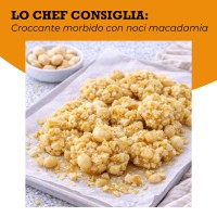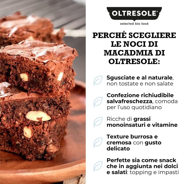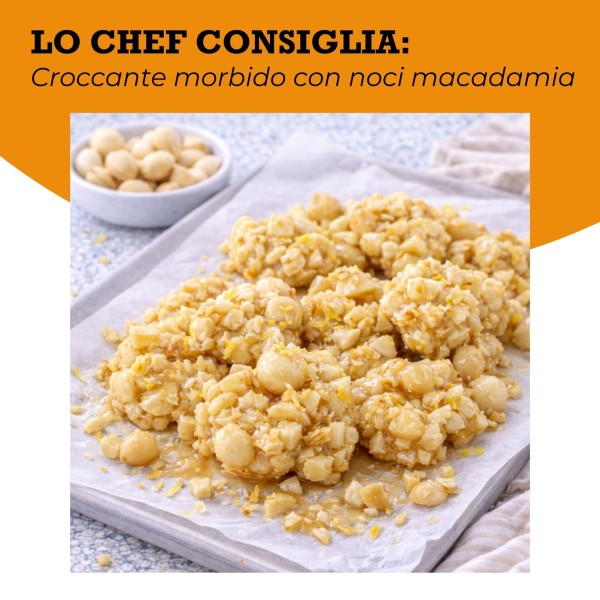 Le noci di macadamia hanno un gusto dolce, rotondo e naturalmente cremoso, che le rende particolarmente eleganti negli abbinamenti. Nel dolce stanno benissimo con cioccolato bianco, vaniglia, cocco, agrumi e miele, dove la loro delicatezza viene valorizzata senza essere coperta. Ottime anche con impasti morbidi, creme e dessert al cucchiaio.
