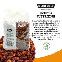 L’Uvetta Sultanina Oltresole è ottenuta dall’essiccazione naturale di uve selezionate, senza aggiunta di zuccheri. Il processo di disidratazione concentra gli zuccheri naturalmente presenti nel frutto, regalando una dolcezza intensa ma equilibrata, con una consistenza morbida e carnosa. Il colore ambrato e la superficie leggermente rugosa sono caratteristiche tipiche del prodotto essiccato correttamente. Al palato risulta dolce, con una nota fruttata persistente e una leggera sfumatura mielata.