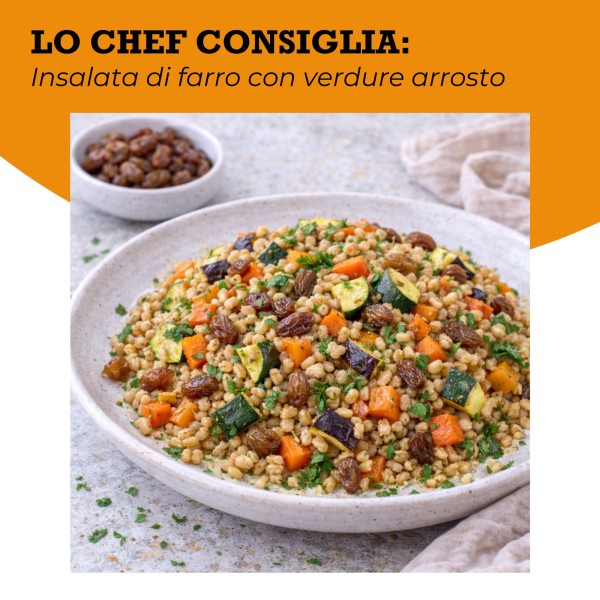 Un piatto equilibrato in cui la dolcezza dell’uvetta crea contrasto con la componente rustica del farro e la nota sapida delle verdure.