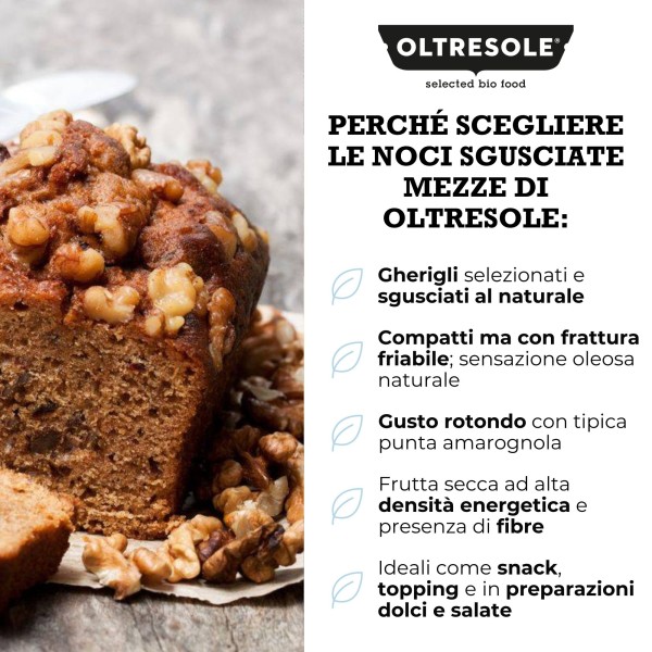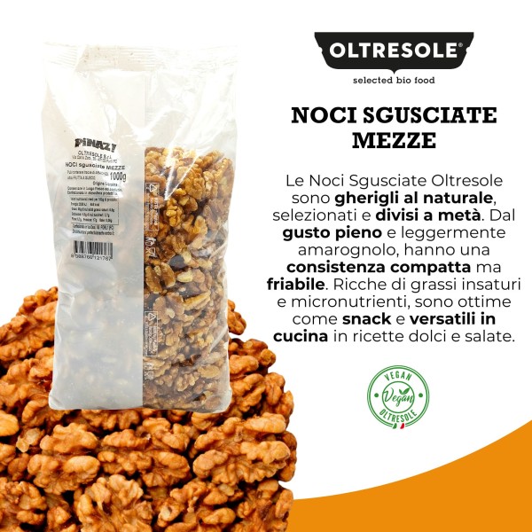 Le noci sgusciate sono estremamente versatili. Possono essere gustate al naturale oppure utilizzate per la preparazione di pesto di noci, burro di noci, creme spalmabili, ripieni e impasti rustici. Nel salato aggiungono struttura a insalate, primi piatti, paste fresche e secondi vegetali, mentre nel dolce valorizzano torte, biscotti e preparazioni da forno grazie alla loro nota aromatica intensa.