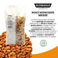 Le Noci Sgusciate Oltresole sono gherigli selezionati e lavorati con cura per preservarne integrità, forma e qualità. Presentano la tipica struttura ampia e lobata, con superficie liscia e tonalità ambrate naturali. Il sapore è pieno, rotondo e leggermente amarognolo, caratteristica tipica della pellicina che avvolge il gheriglio e che contribuisce alla complessità aromatica. La consistenza è compatta ma friabile al morso, con una naturale nota oleosa che ne arricchisce la percezione gustativa.