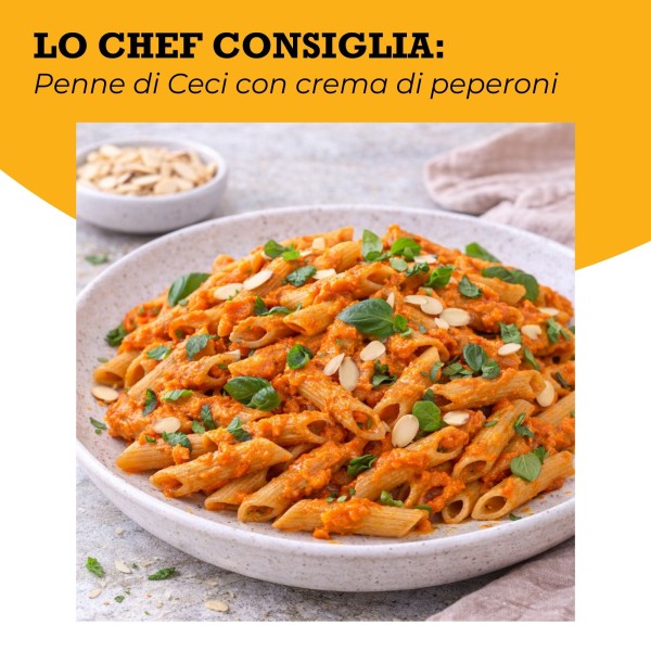 Un primo piatto vegetale ricco e strutturato, dove la dolcezza del peperone incontra la nota rustica del cece.