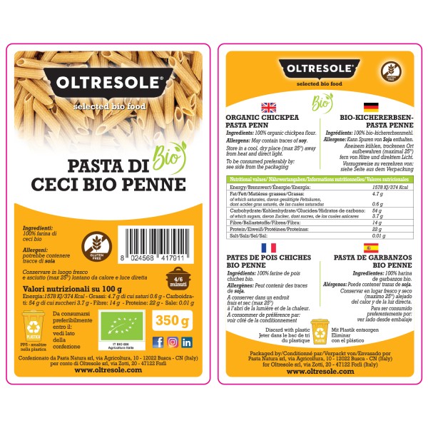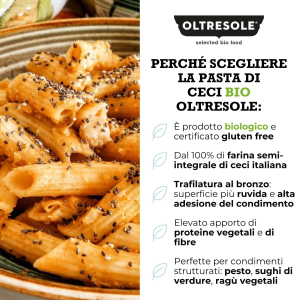 Le Penne di Ceci Biologiche di Oltresole sono realizzate con il 100% di farina di ceci semi-integrale biologica e italiana, certificata Gluten Free. Viene lavorata artigianalmente con trafila al bronzo ed essiccazione lenta a bassa temperatura. Questo processo consente di preservare struttura, aroma e caratteristiche organolettiche della materia prima. La superficie risulta naturalmente ruvida, ideale per trattenere i condimenti, mentre la consistenza è compatta e piacevolmente tenace al morso. Il sapore è pieno, con la tipica nota intensa e leggermente rustica del cece.