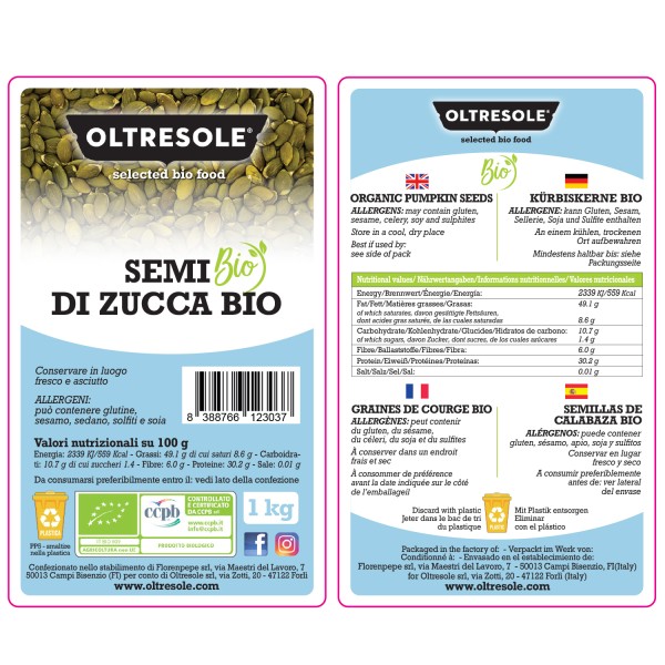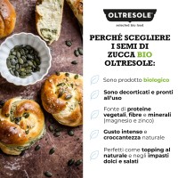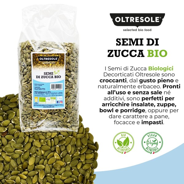 I Semi di Zucca Biologici Decorticati Oltresole, sono ottenuti da coltivazioni certificate e lavorati senza tostatura né aggiunta di sale, per preservare intatte tutte le loro proprietà nutrizionali. Dopo la raccolta, vengono accuratamente sgusciati per offrire un alimento pronto al consumo, ideale per arricchire la dieta quotidiana con gusto e naturalezza. Il prodotto si presenta in chicchi verdi, ovali e fragranti, dal sapore intenso e lievemente erbaceo.